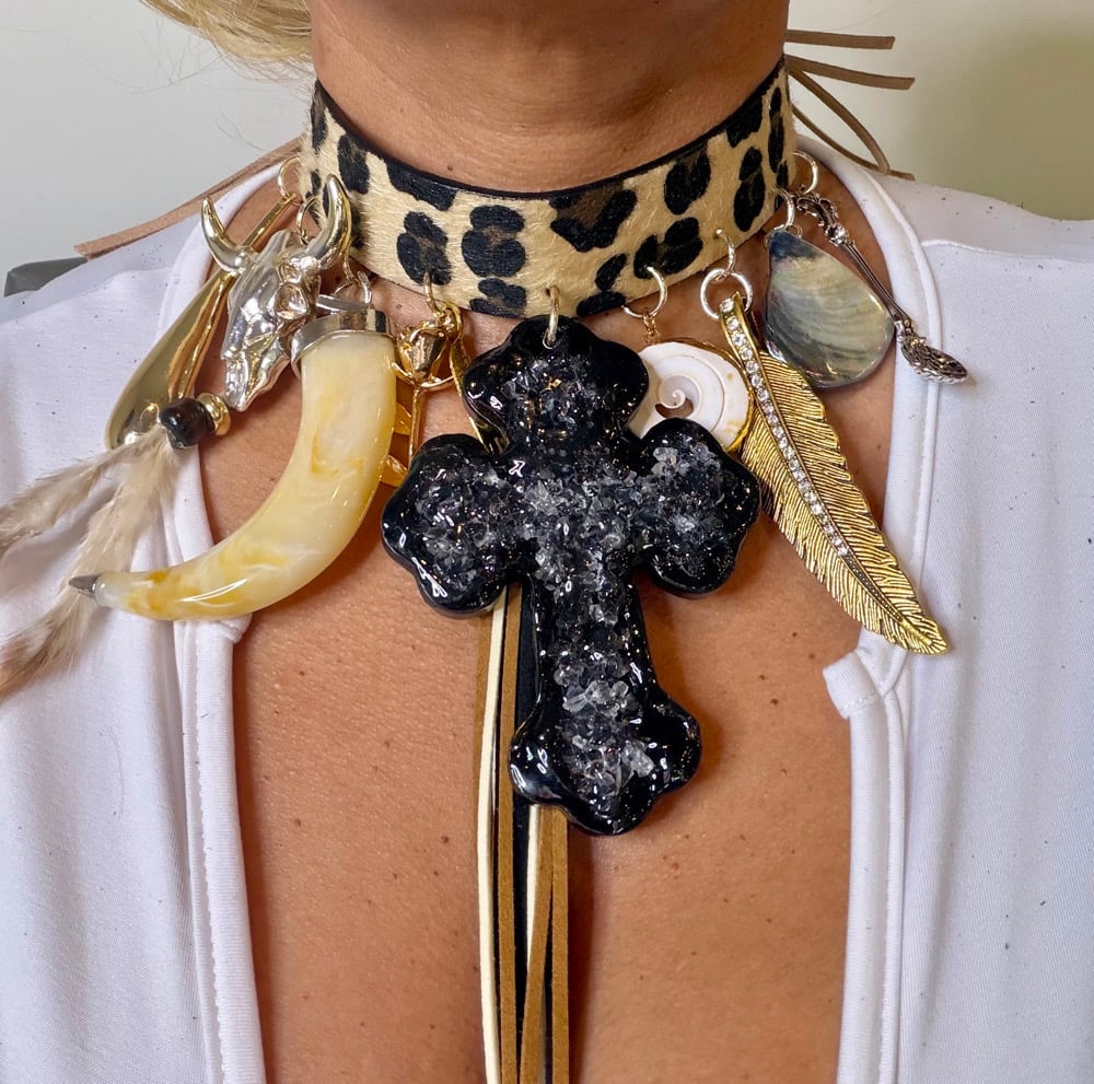 A beautifully custom, handcrafted choker necklace adorned with distinctive, unique charms. Designed as a one-size-fits-all piece, it has a tie back closure for a fully adjustable and comfortable fit. No two necklaces are identical, making each piece a singular expression of individuality and craftsmanship.