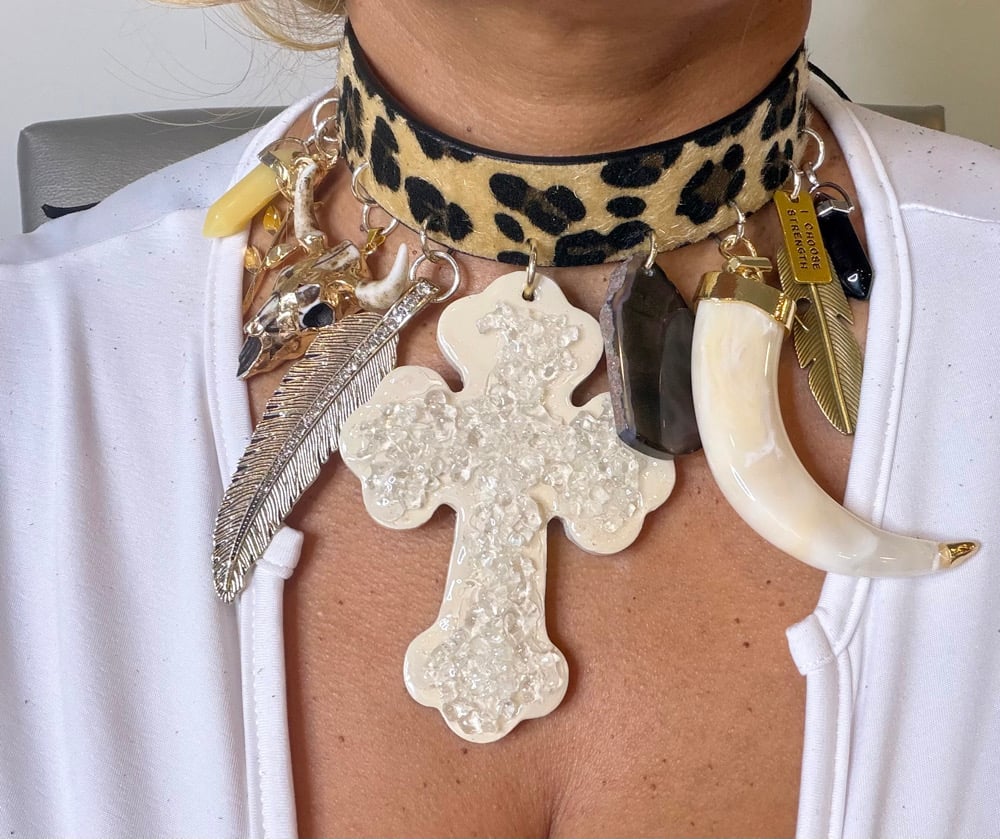 A beautifully custom, handcrafted choker necklace adorned with distinctive, unique charms. Designed as a one-size-fits-all piece, it has a tie back closure for a fully adjustable and comfortable fit. No two necklaces are identical, making each piece a singular expression of individuality and craftsmanship.