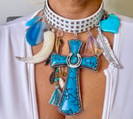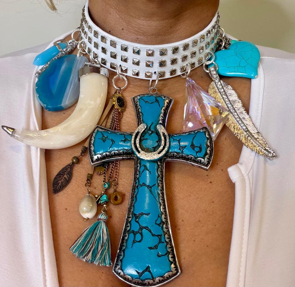 A beautifully custom, handcrafted choker necklace adorned with distinctive, unique charms. Designed as a one-size-fits-all piece, it has a tie back closure for a fully adjustable and comfortable fit. No two necklaces are identical, making each piece a singular expression of individuality and craftsmanship.